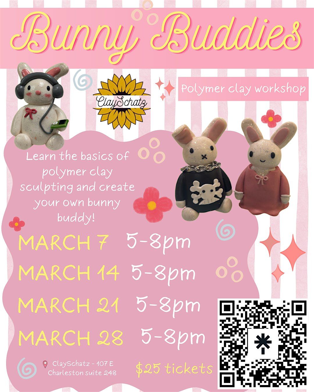 learn the basics of polymer clay sculpting and create your own bunny buddy! I will teach you how to sculpt the base of the bunny and you will be able to add accessories and decorate it to make it uniquely yours.