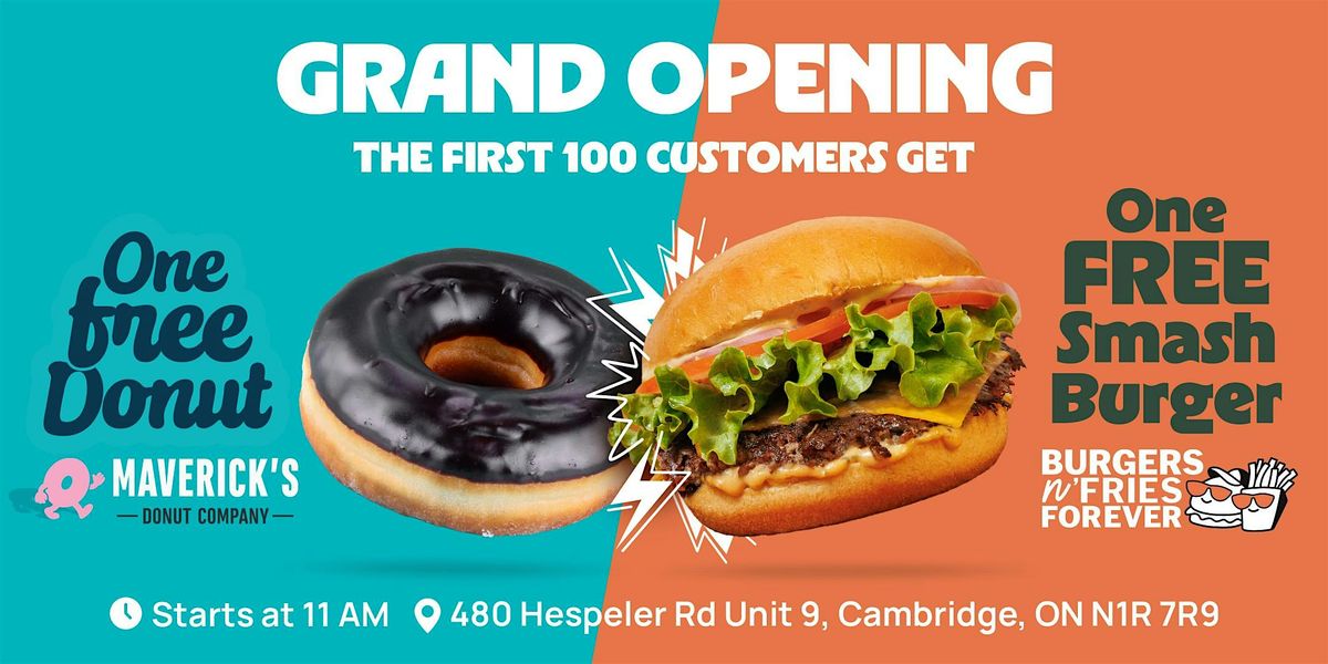 Welcome to the grand opening of Burgers n' Fries Forever (BFF)& Maverick's Donut Company in Cambridge! Join us at 480 Hespeler Road for a mouth-watering celebration.