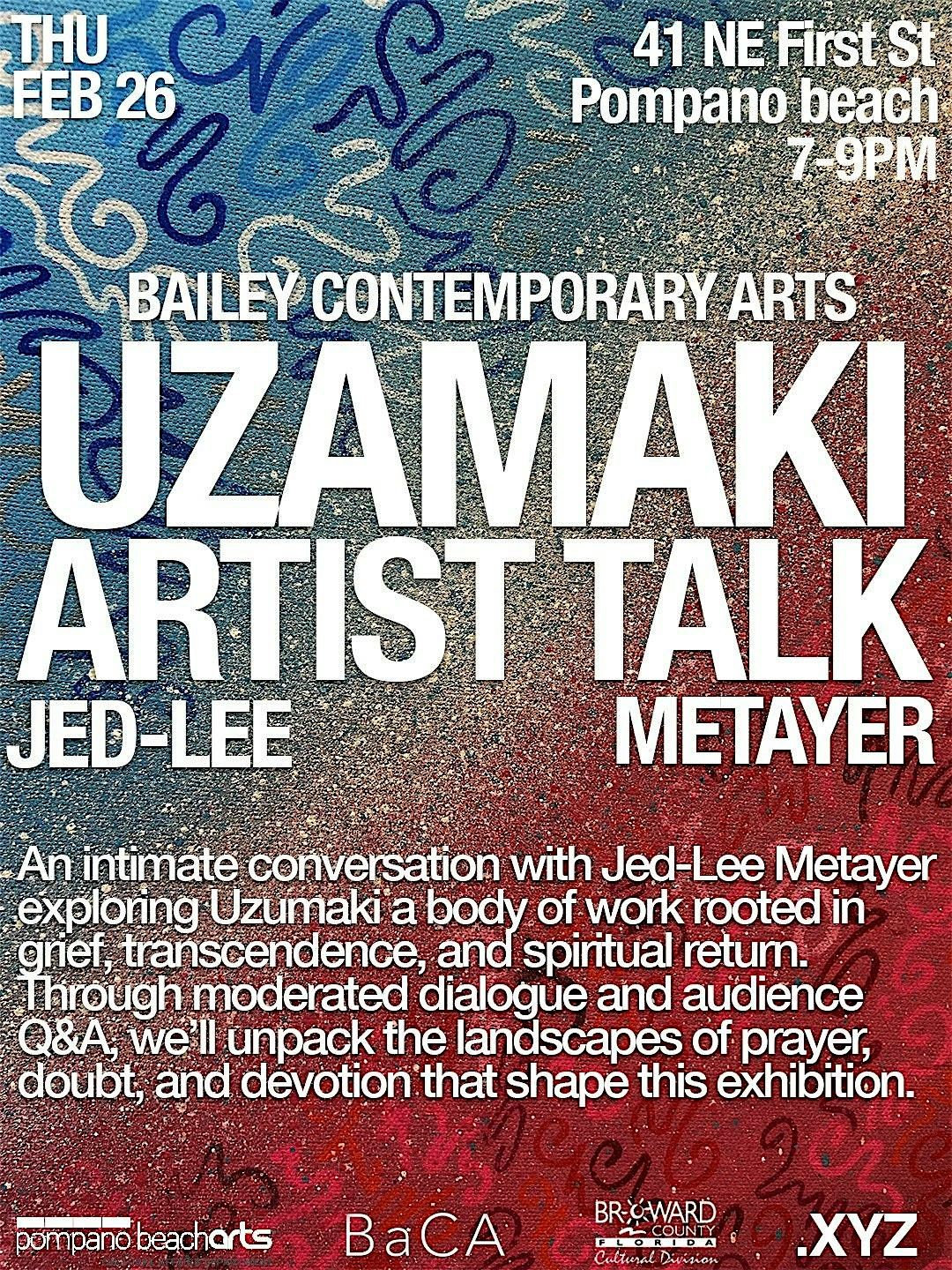 This artist talk offers a closer look at Uzumaki, Jed-Lee Metayer’s current exhibition at Bailey Contemporary Arts. During the conversation, Jed-Lee will share insight into the ideas behind the work, what inspired the series, and how the pieces came together.