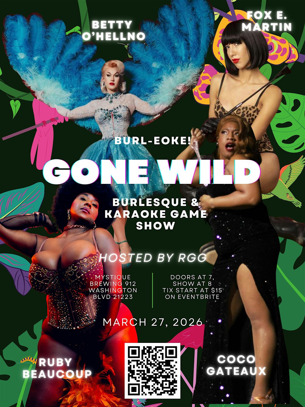 Featuring your favorite burlesque dancers- Betty O'Hellno, Coco Gateaux, Fox E Martin, and Ruby Beaucoup. With your host, RGG!