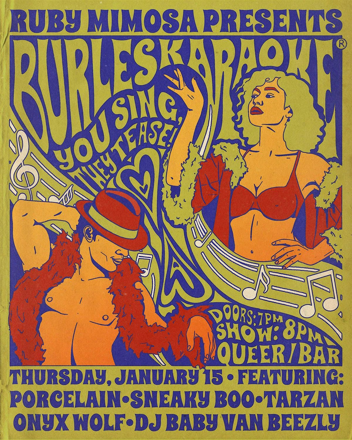 Welcome to BurlesKaraoke®! Ruby Mimosa & Queer Bar invite you to an unforgettable experience where you, the audience, become part of the show. Enjoy the award-winning performances of burlesque artists as they tease, please, delight, and surprise you. At BurlesKaraoke, the spontaneity of karaoke and the thrill of improvisational performance art come together for a night of hollering and dollar-spreading fun! Get ready to experience something truly off the cuff!