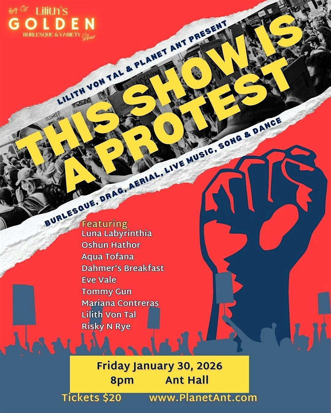 Local burlesque icon, Lilith Von Tal, is beginning her 2026 season with a BANG. This iteration of Lilith's Big Ol' Golden Show is self-explanatory: This Show Is a Protest. Uniting with a cast full of top notch talent, Lilith brings you a night of burlesque, drag, aerial, music, song and dance that will have audiences cheering with raised fists and singing protest songs.