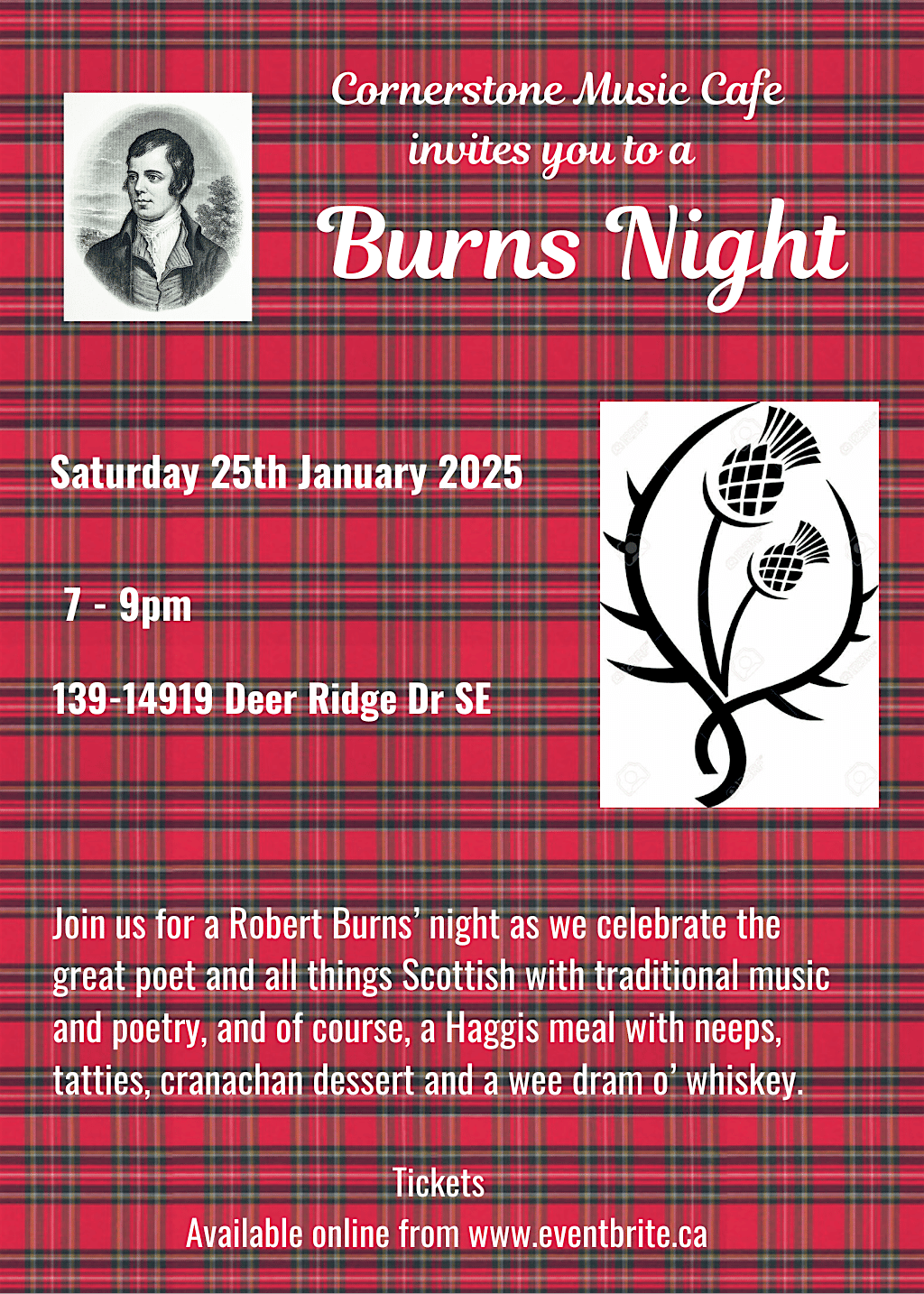 Join us for a lively and traditional Robbie Burns Night at Cornerstone Music Café! Celebrate the life and legacy of Scotland's beloved poet, Robert Burns, with an evening filled with music, poetry, delicious Scottish fare, and great company.