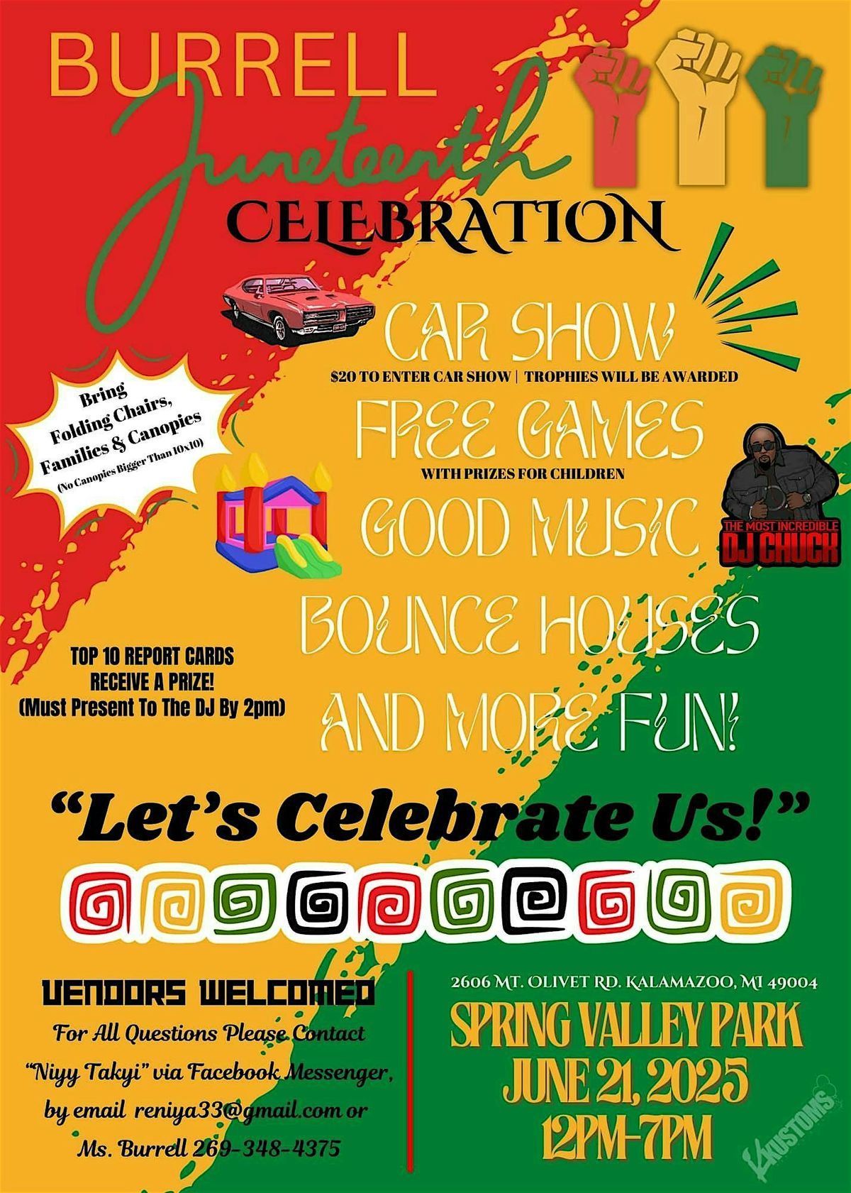 🎶DJ Chuck will be kickin off the tunes and keeping the vibes going all afternoon long. There will be bouncy houses, Games, goodie bags, Rewards for good report cards, raffles and more. Along wih A Juneteen scavenger hunt & Competitions to win prizes.