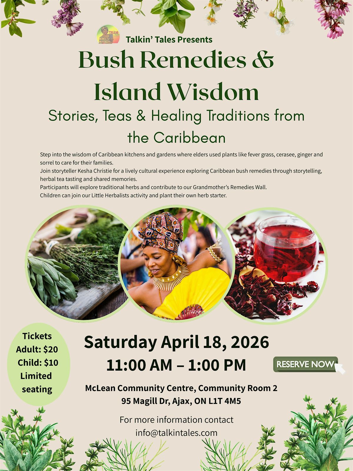 Join storyteller and cultural educator Kesha Christie, founder of Talkin’ Tales, for an engaging and interactive cultural experience exploring Caribbean bush remedies through storytelling, herbal tea tasting, and shared memories.