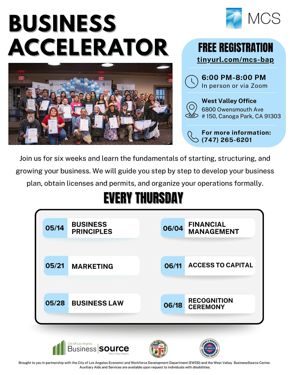 Our Business Accelerator is a free 6-week program of hands-on workshops designed to help you start your business on a solid foundation or strengthen a business that is already operating. This program will provide you with the tools you need to organize, grow, and move forward with confidence.