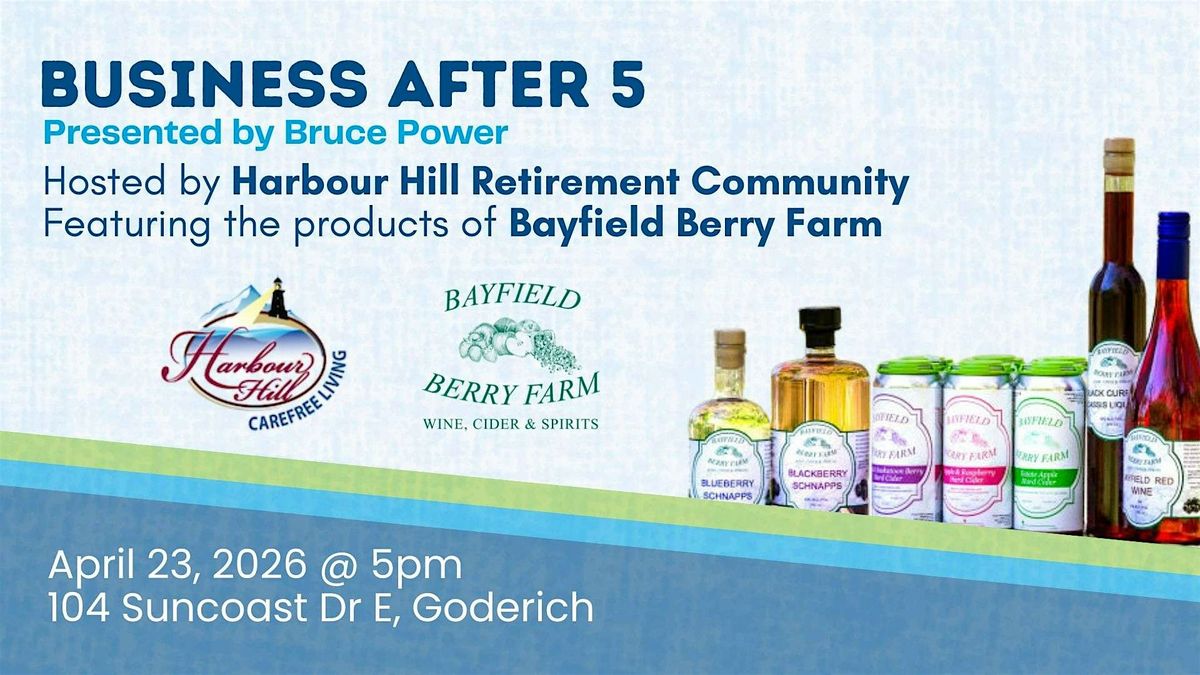 Join us for a special Business After 5 at Harbour Hill Retirement Community in Goderich, where great conversation, new connections, and local flavour come together. Along with the usual Chamber networking atmosphere, this evening will feature a tasting experience highlighting Bayfield Berry Farm’s locally crafted wines and spirits, including fruit wines, hard ciders, and schnapps made from the farm’s signature berries and orchard fruits. It’s a chance to connect with fellow business and community leaders in a relaxed setting while enjoying some distinctly Huron County products