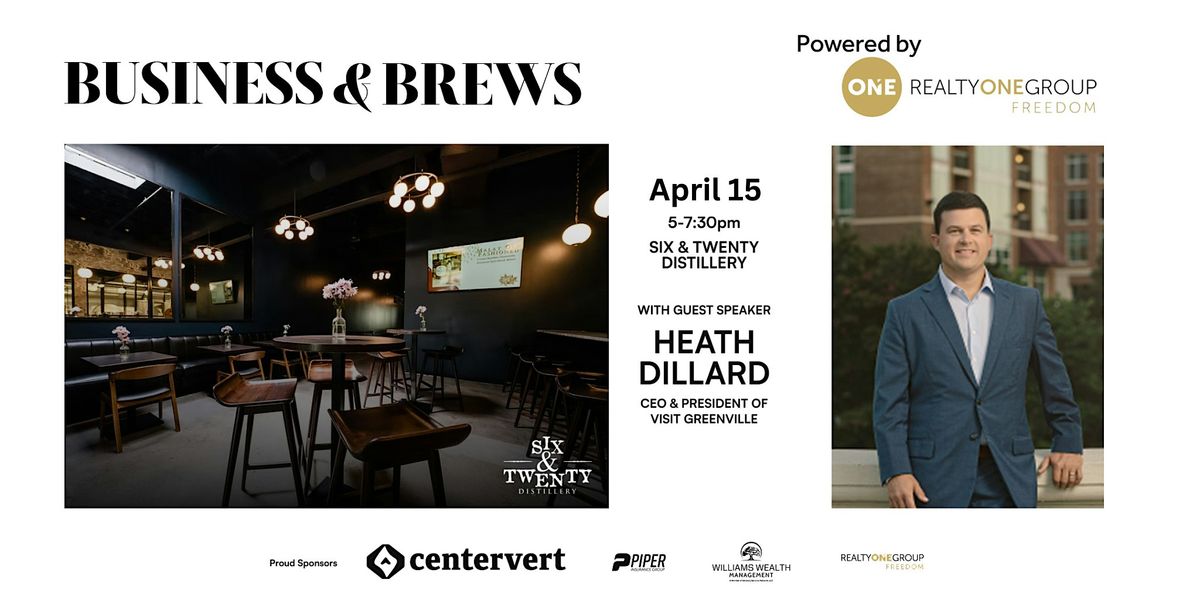 Business & Brews is a Professional networking social for community-engaged professionals of all walks of life across South Carolina. Free to attend and open to the public. This event will feature Heath Dillard, CEO, VisitGreenvilleSC. This event is sponsored by Realty One Group.