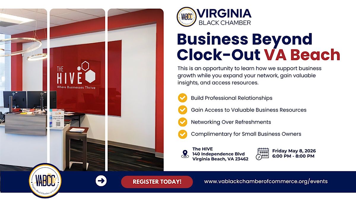 Join us for Business Beyond the Clock Out in Virginia Beach, an evening designed to help you learn how we support business growth while you expand your network, gain valuable insights, and access resources. This event focuses on relationship building and connecting you to the growing ecosystem of programs, partnerships, and opportunities the Chamber is building across Virginia to support Black-owned businesses. Whether you are just starting or ready to scale, this is an opportunity to get connected and plugged in.