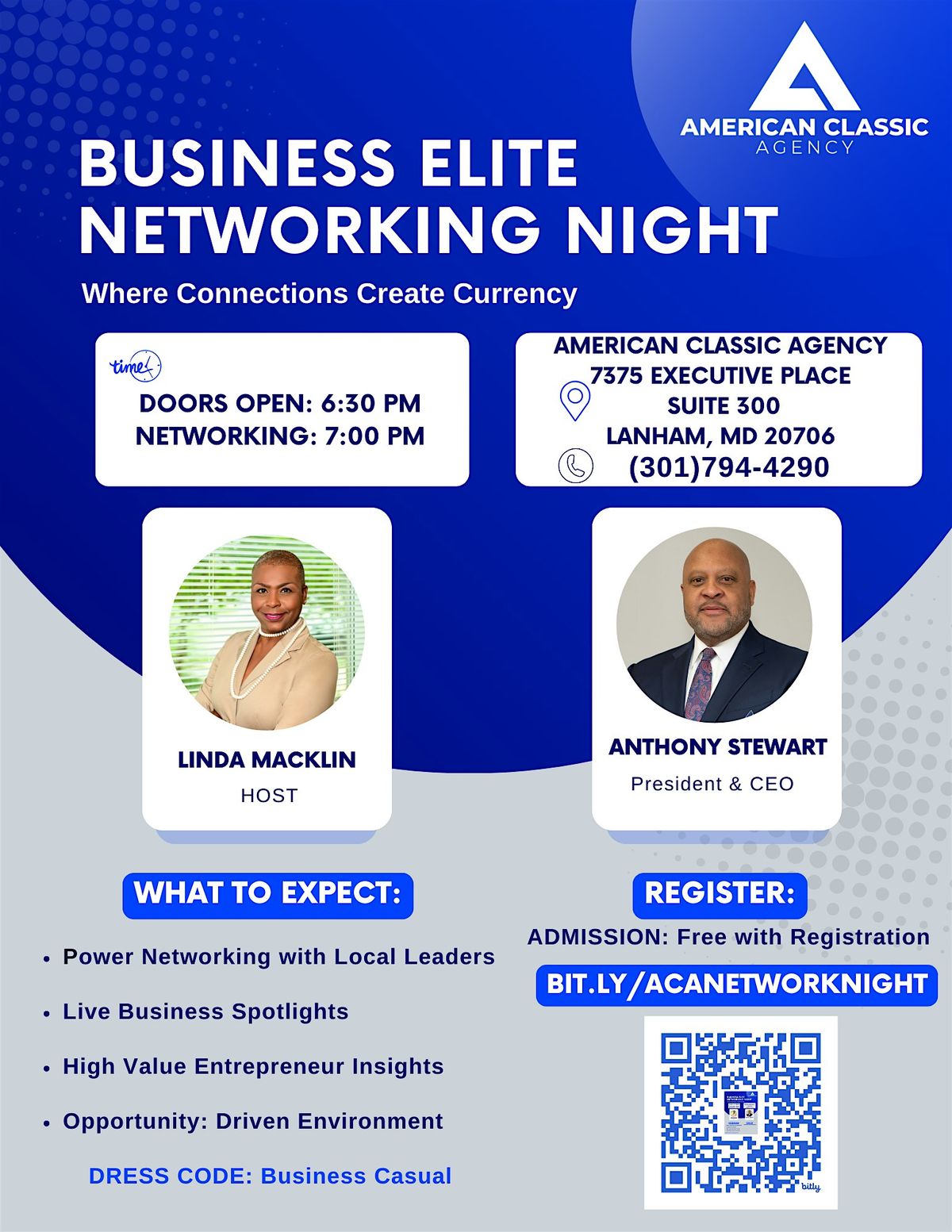 Welcome to the Business Elite Networking Night! Join us for an evening of connecting with top professionals in the industry at the American Classic Agency. This is your chance to expand your network, exchange ideas, and build valuable relationships. Don't miss out on this exclusive opportunity to mingle with the best and brightest in the business world. Come prepared to make meaningful connections and take your career to the next level. See you there!