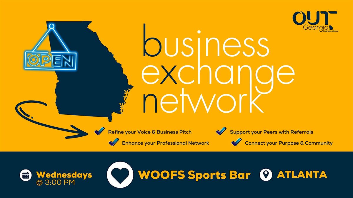 Join us every week for structured business networking at OUT Georgia's Business eXchange Network (BXN): Atlanta held Wednesdays at Woof's Sports Bar, an OUT Georgia Member & LGBTQIA+-owned establishment!