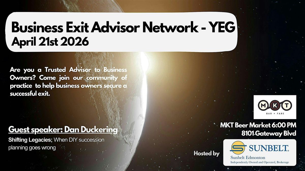 The BUSINESS EXIT ADVISOR NETWORK YEG Meetup is being held on Tuesday April 21st @ 6:00pm – MKT Beer Market - 8101 Gateway Blvd NW, Edmonton
