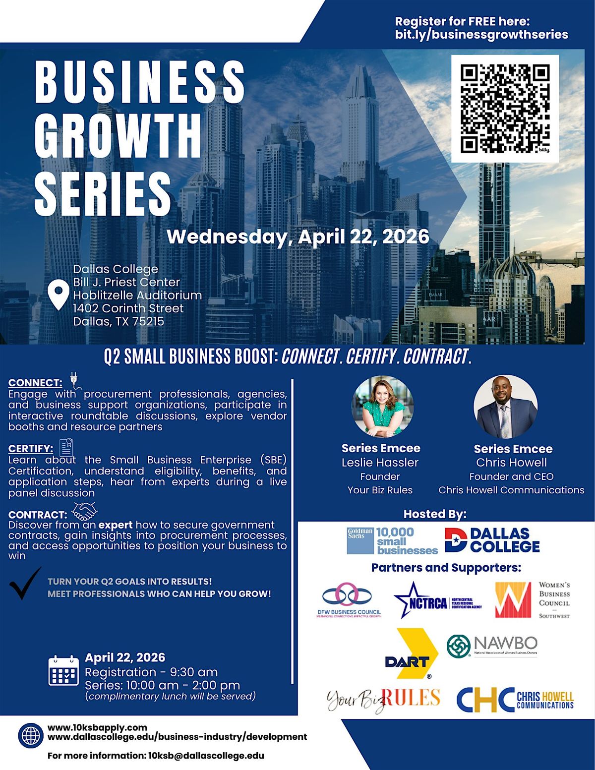 Join Dallas College, Goldman Sachs 10,000 Small Businesses and Industry Partners for an exciting event designed to help your small business thrive! Network with like-minded entrepreneurs, learn how to certify your business as a Small Business Enterprise (SBE), and discover how to land those game-changing contracts. Don’t miss out on this chance to connect, certify, and contract your way to business success.