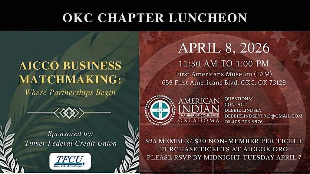 Event Information: Join us for the AICCO Business Matchmaking Luncheon, designed to spark powerful new partnerships across Indian Country.This fast-paced “networking with purpose” experience brings together entrepreneurs, executives, and community leaders for guided rotations that make it easy to connect, collaborate, and uncover real opportunities.Guests will enjoy a curated business-matching format, conversation starters, and plenty of time to exchange ideas, build relationships, and strengthen the vibrant AICCO network.