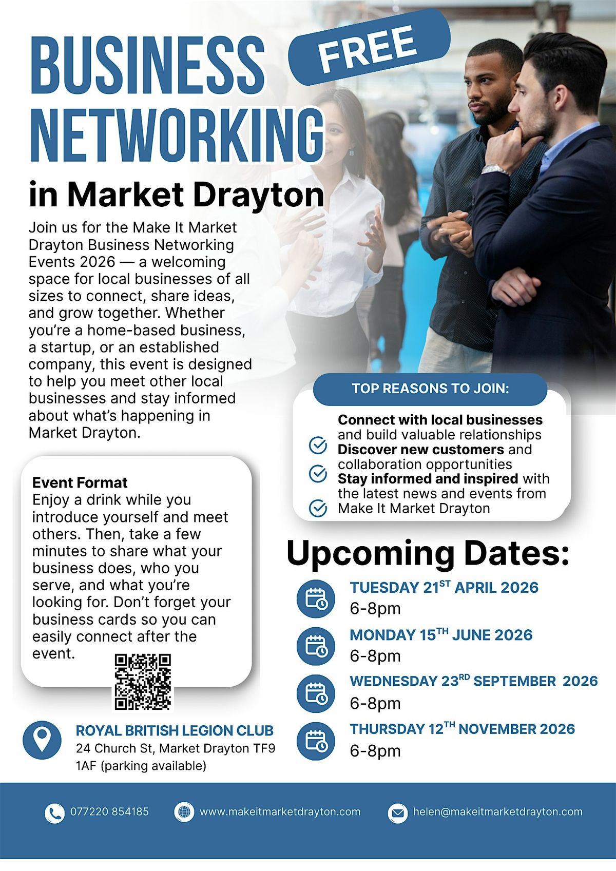Join us for the Make It Market Drayton Business Networking Events 2026 — a welcoming space for local businesses of all sizes to connect, share ideas, and grow together. Whether you’re a home-based business, a startup, or an established company, this event is designed to help you meet other local businesses and stay informed about what’s happening in Market Drayton.