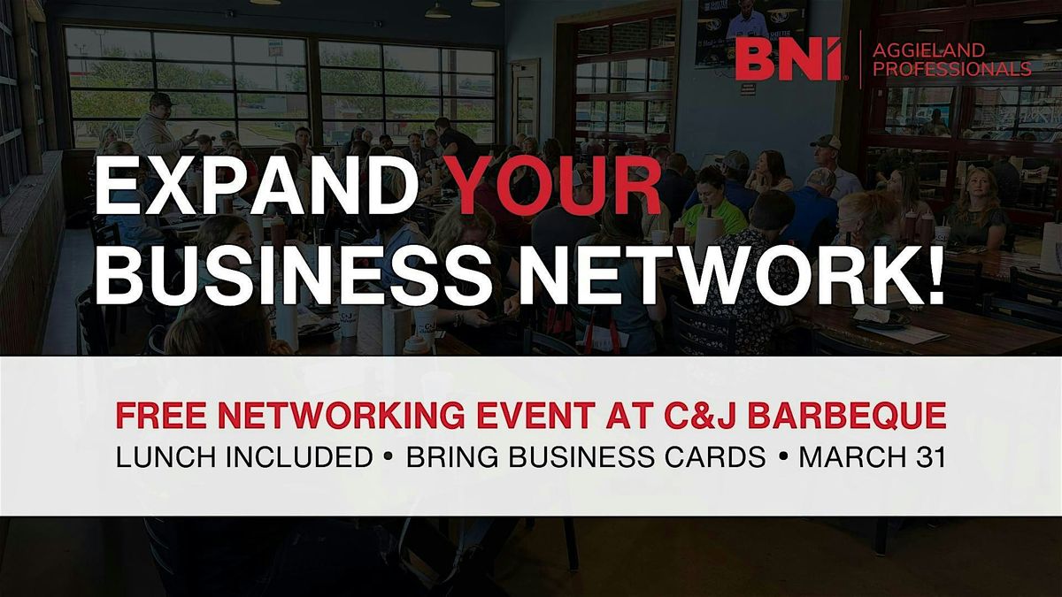 Come join us for a networking lunch March 31, 2026 from 11:45 AM to 1:30 PM at C&J Barbeque. There will be door prizes, member testimonials, Q&A session, and lunch on us! This event is open to all Aggieland professionals — BNI membership is not required to attend!