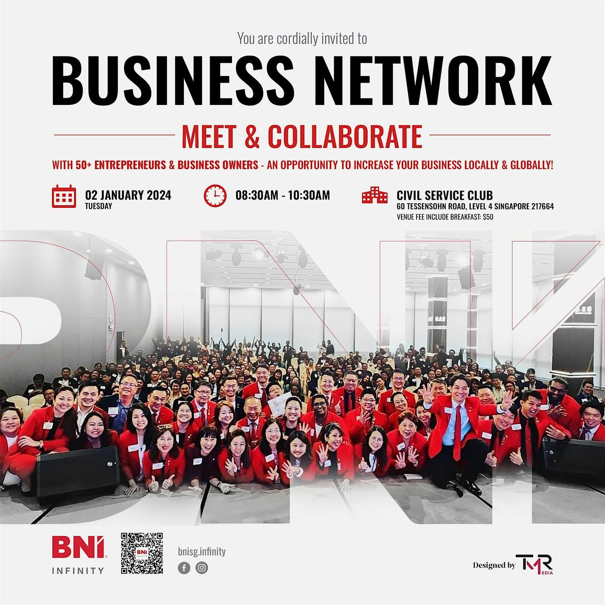 Join us for an exciting opportunity to expand your network and connect with like-minded professionals at the Business Networking with BNI Infinity event. This in-person event will occur every Tue at 08:30:00 GMT+0800 (Singapore Standard Time).