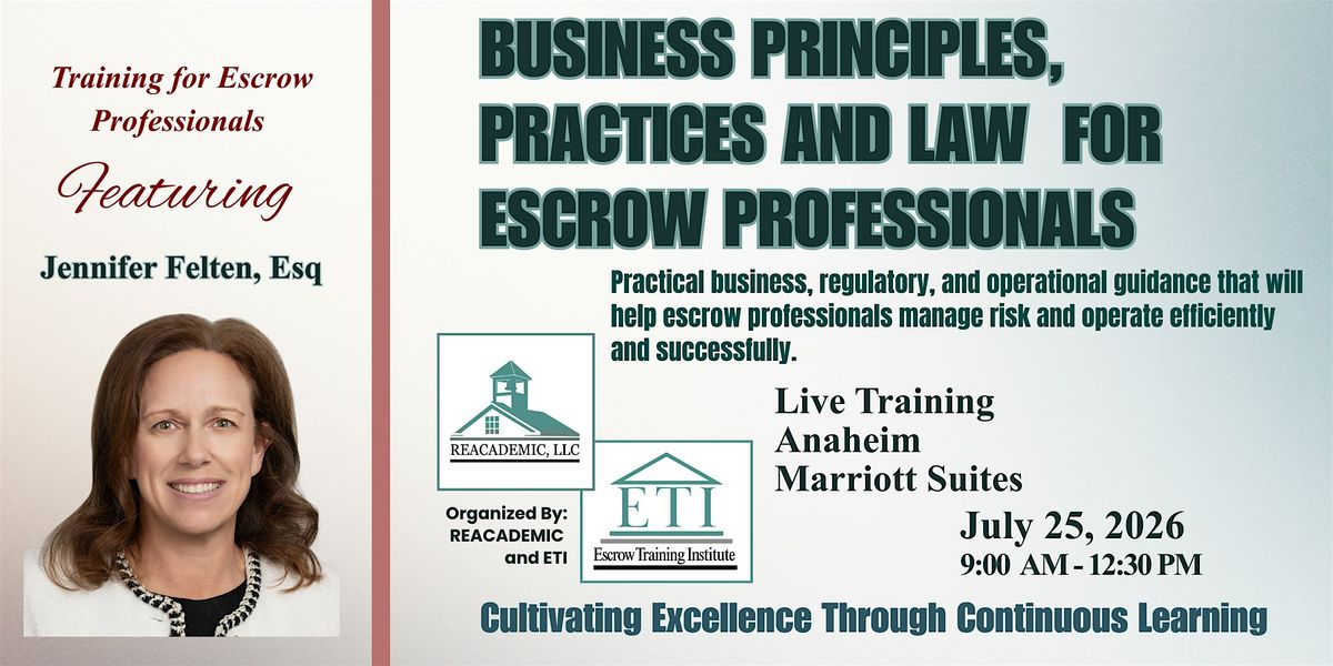 This course provides a comprehensive review of the core business, legal, and operational principles that govern escrow operations. Participants will gain practical guidance on setting and negotiating escrow fees, understanding marketing limitations under RESPA and California Financial Code, and avoiding referral fee and kickback violations.