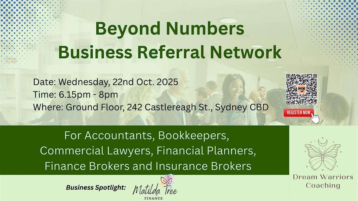 Beyond Numbers Business Referral Network for Accountants, Bookkeepers, Planners and Brokers is designed for business owners in the Accounting, Bookkeeping and Financial Services Industry to connect with likeminded finance professionals, build meaningful and authentic relationships in a positive and supportive environment.