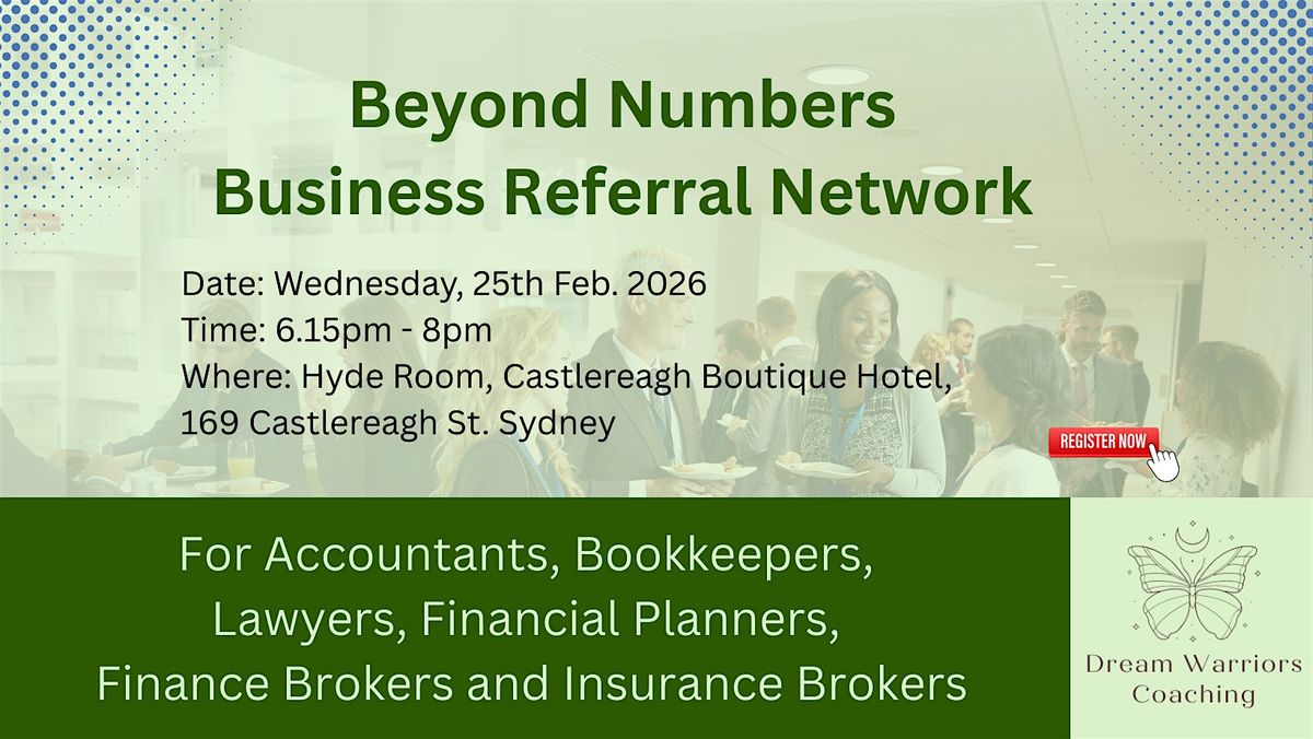 Beyond Numbers Business Referral Network for Accountants, Bookkeepers, Planners and Brokers is designed for business owners in the Accounting, Bookkeeping and Financial Services Industry to connect with likeminded finance professionals, build meaningful and authentic relationships in a positive and supportive environment.