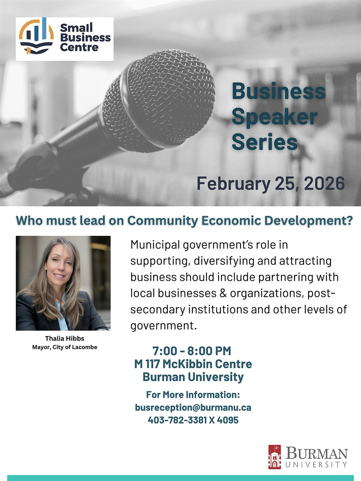 Attend this month's Business Speaker Series event with Lacombe's Mayor, Thalia Hibbs, she's talking about community economic development.