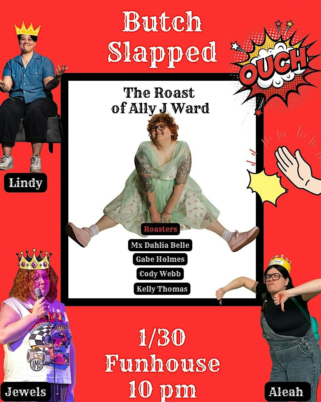 butch slapped presents: the (queer) roast of ally j. ward. featuring some of portland's most iconic comedians roasting ally, each other, and the hosts. also featuring improv based on the roast, where we will have even more iconic queer comedians