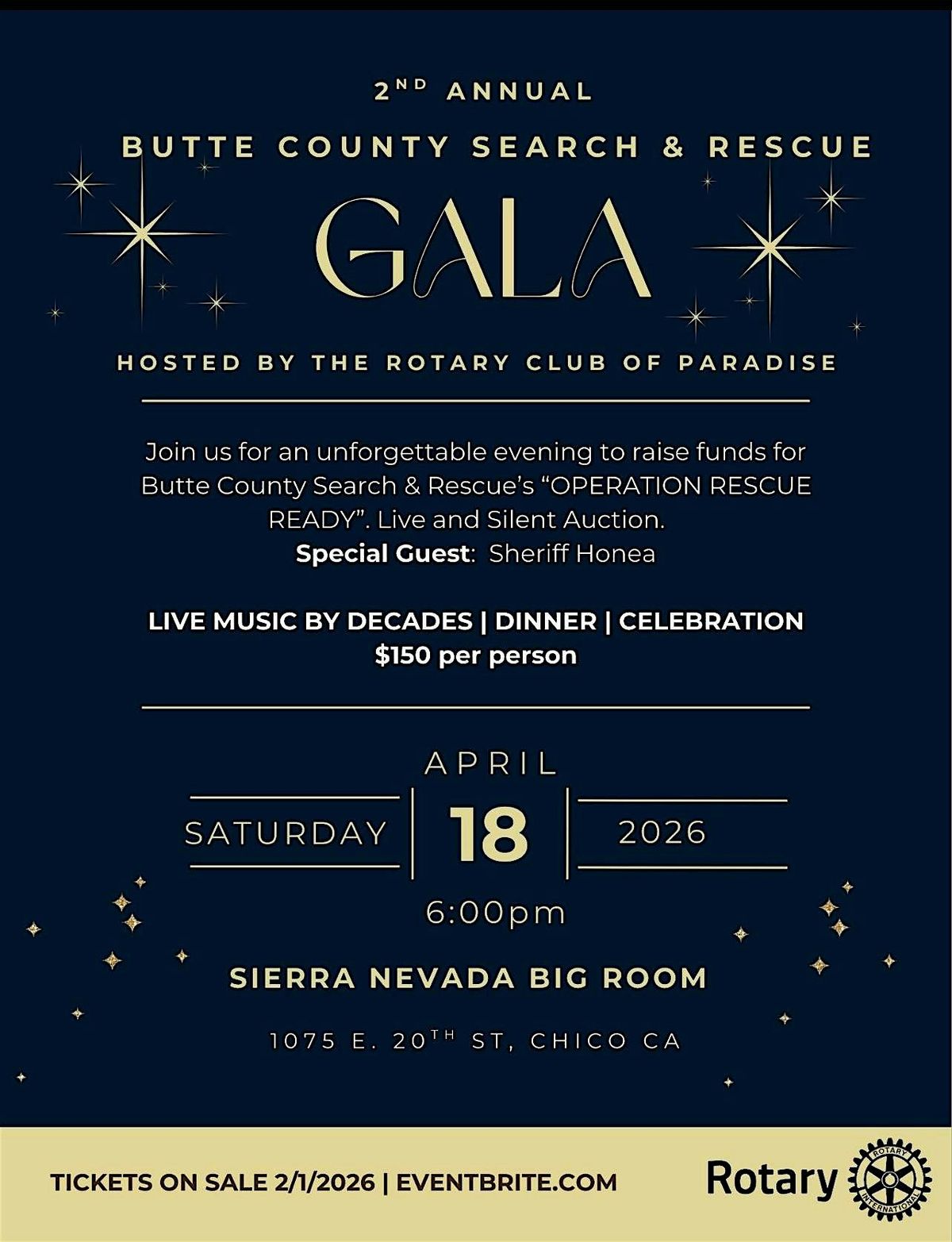 The 2nd Annual Butte County Search & Rescue Gala wil be held April 18, 2026 at Sierra Nevada's Big Room. There will be live music from Decades, dinner, and a silent and live auction. All funds raised will benefit Search & Rescue's Operation Rescue Ready.