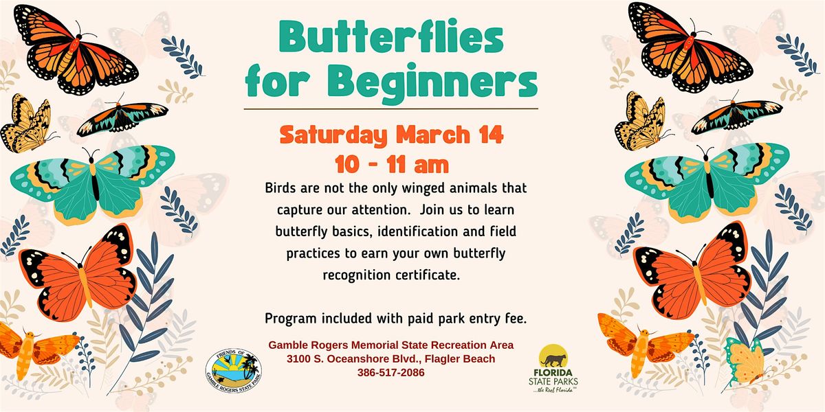 Birds are not the only winged animals that capture our attention. Many people are rapidly discovering the excitement of butterfly watching. Gamble Rogers State Park participates in the “Wings Over Florida” butterfly program. Join Betty and Bill on a fun and informative stroll down butterfly lane where you will learn butterfly basics, identification and field practices to earn your own butterfly recognition certificate. Program is included with paid park entry fee.