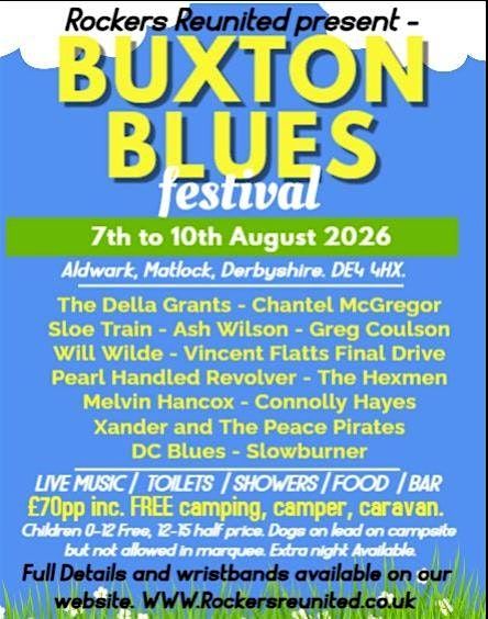A small friendly Blues Festival in Derbyshire Peak District. (500 Limit) This event sells out quickly so please purchase wristbands as soon as possible to avoid disappointment. FREE camping. No extra charges for Motorhomes, caravans, campers, awnings or car parking! Children 0-11 FREE, 12-15 half price. Dogs welcome on site but NOT in the marquee. Clean toilets. Showers. Great food and bar at non hiked up prices! Full details on our website https://www.rockersreunited.co.uk/copy-of-buxton-blues-august-2023