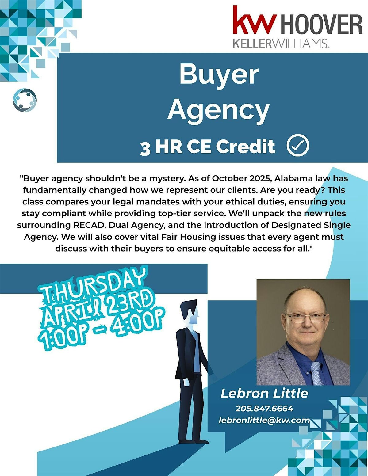 "Buyer agency shouldn't be a mystery. As of October 2025, Alabama law has fundamentally changed how we represent our clients. Are you ready? This class compares your legal mandates with your ethical duties, ensuring you stay compliant while providing top-tier service. We’ll unpack the new rules surrounding RECAD, Dual Agency, and the introduction of Designated Single Agency. We will also cover vital Fair Housing issues that every agent must discuss with their buyers to ensure equitable access for all."