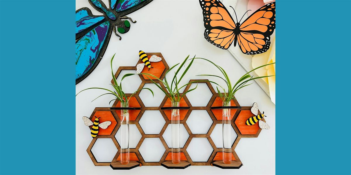 Transform your space into a buzzing, blooming oasis with your own handmade honeycomb-inspired propagation/flower station. This functional piece of art features three glass tubes nestled neatly into the hexagons, making it perfect for rooting spider plants, pothos, or displaying single stem flowers.