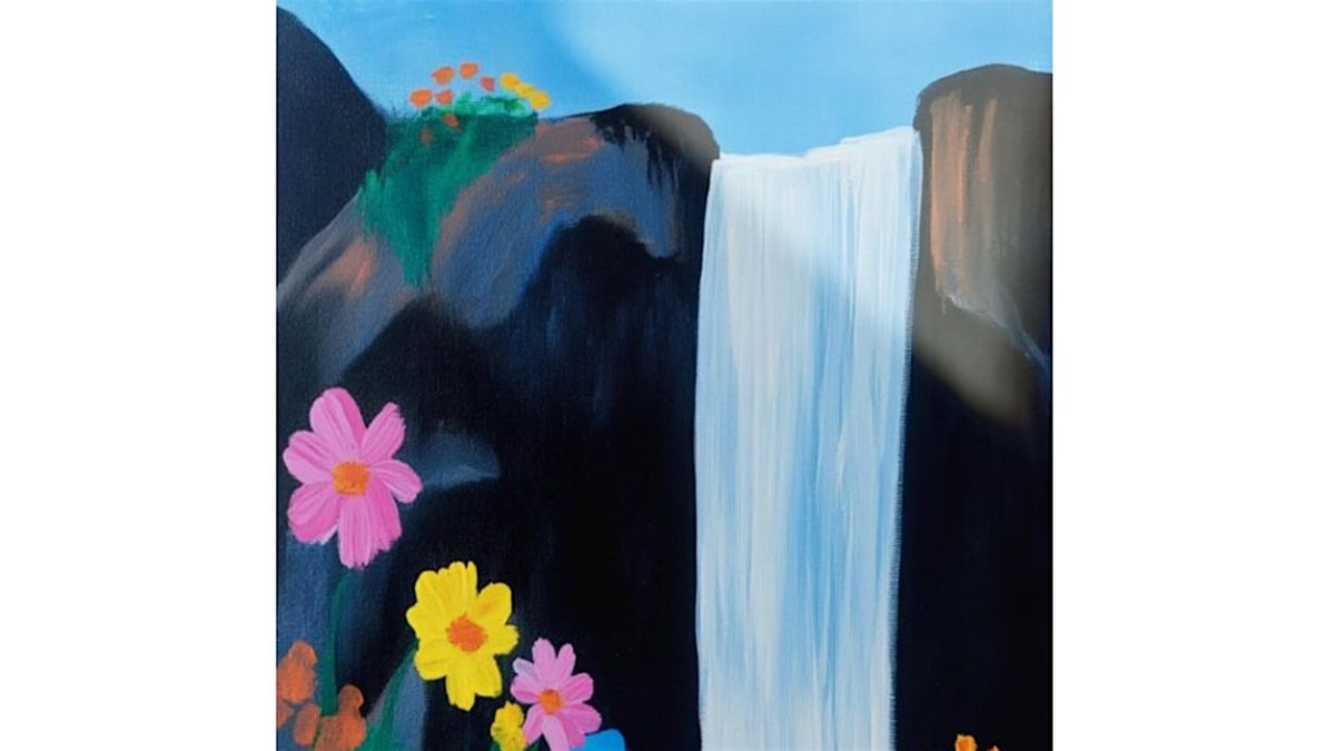 Paint a serene waterfall surrounded by vibrant flowers—sip, unwind, and bring this peaceful scene to life for 2 hours!