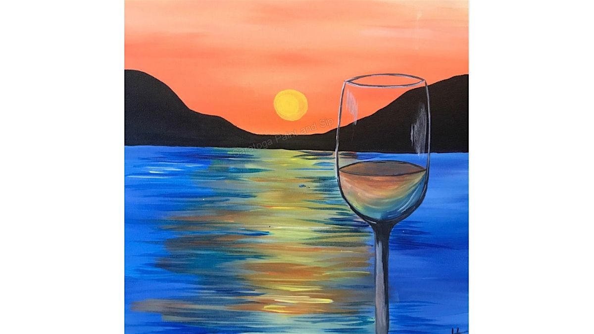 Create a bold sunset over water with a wine glass in the forefront with rich colors. A relaxing escape on a canvas. Great vibes with a piece to take home.