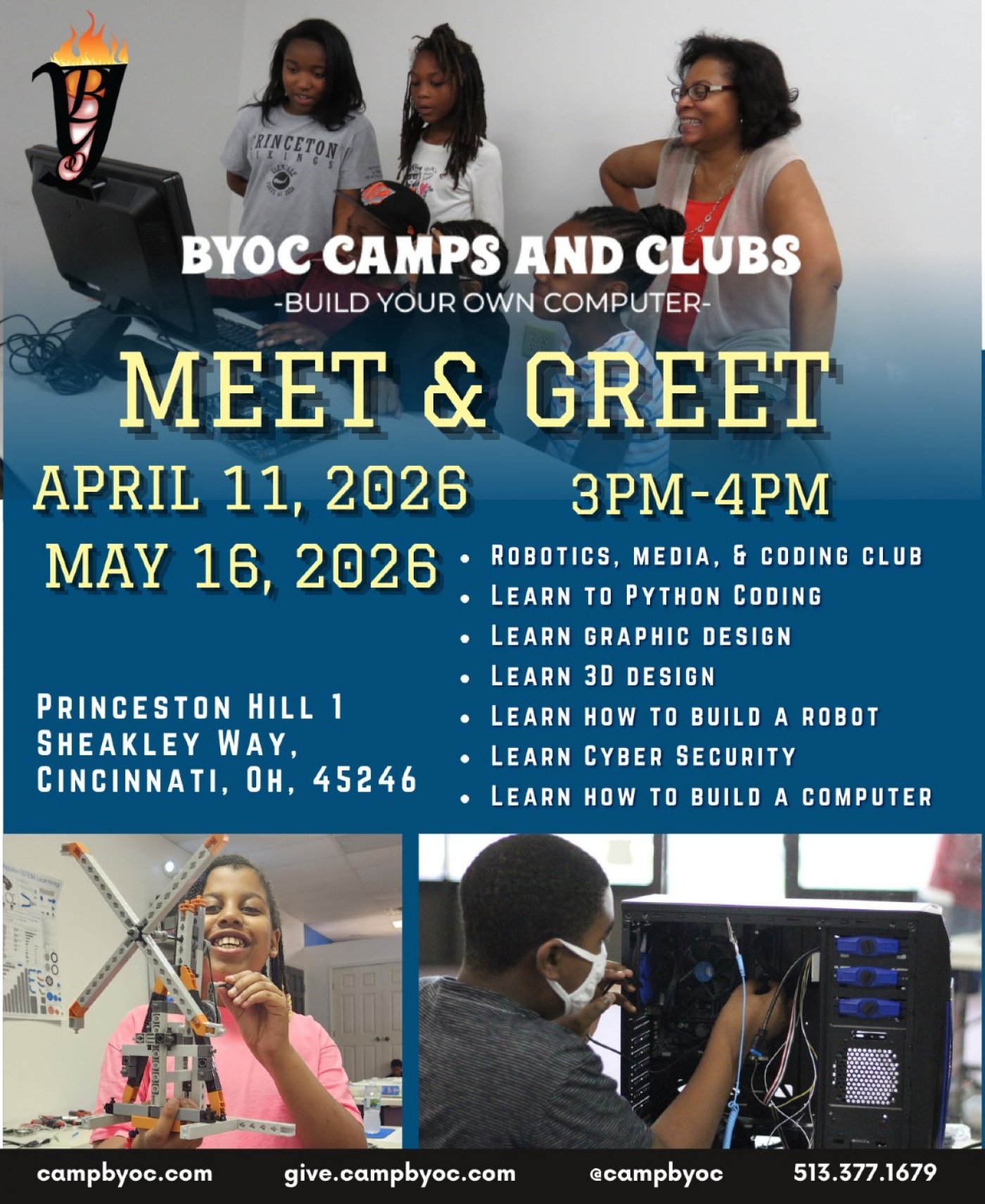 Are you looking for a community that prepares your child for the high-demand world of technology? Join BYOC (Build Your Own Computer) Camps and Clubs for an inviting Meet & Greet! This free event is designed for parents and students (ages 9-17) to learn who we are and what we do.
