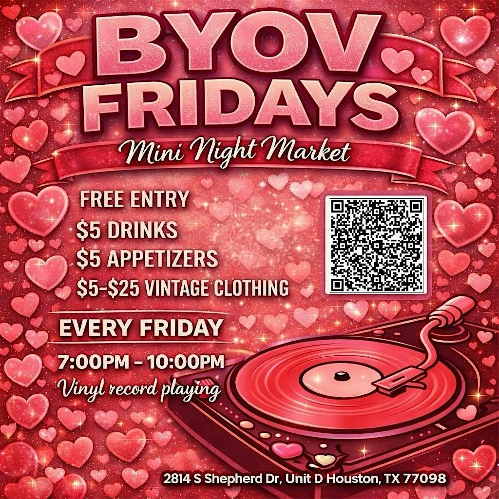 Get ready to groove to your favorite vinyl tunes, sip on drinks, munch on good food, and shop from local vendors at BYOV Fridays!