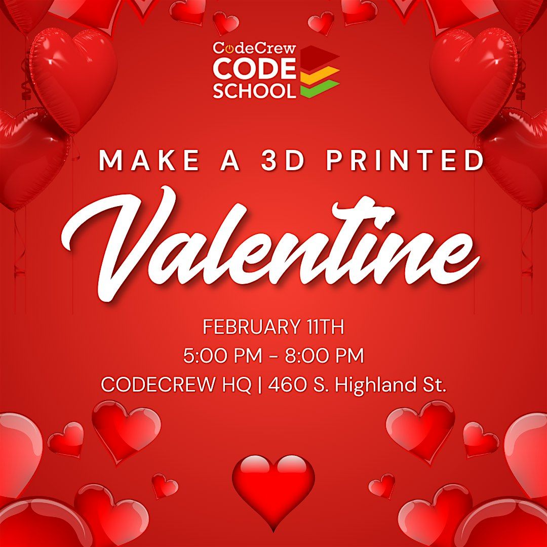 Join us in person for a fun and creative session where you'll learn how to design and 3D print your very own Valentine's Day gift! Whether you're a beginner or a pro, this event is perfect for anyone who loves tech and making cool, personalized presents. Come ready to get hands-on and take home something uniquely 3D printed just for your Valentine!