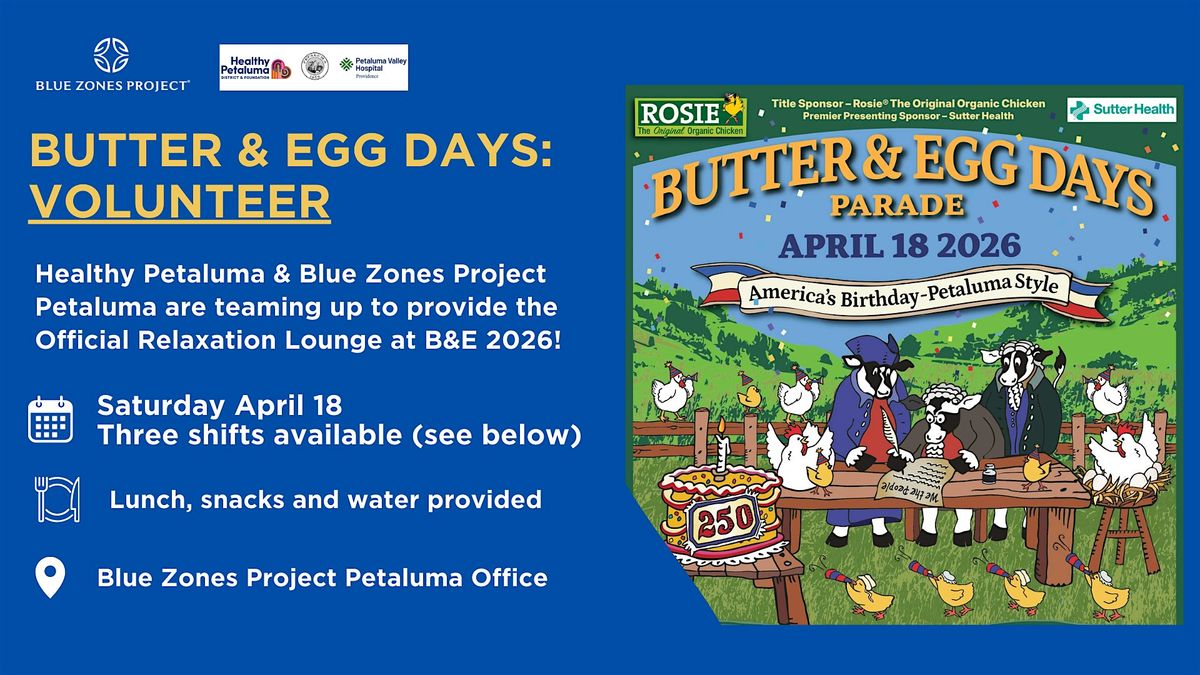 We need your help! Blue Zones Project Petaluma and Healthy Petaluma District & Foundation are teaming up to provide The Official Relaxation Lounge for Butter & Egg Days Parade 2026! But we need your help in supporting the smooth success of this offering!