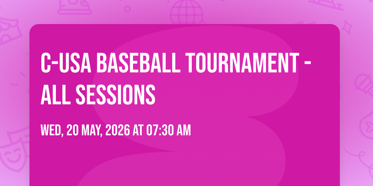 π Location: 34.0339, -84.5817π Welcome to C-USA Baseball Tournament - All Sessions, where the impossible becomes possible and dreams take flight! ποΈ Join us at Mickey Dunn Stadium in the heart of Kennesaw, GA for an event that will redefine your expectations. π On May 20th, 2026 at 07:30 AM, witness the transformation of space and time into something truly magical. β¨ It's a curated experience combining the best of innovation, entertainment, and community spirit, creating moments that will be remembered for years to come. Whether you're a first-time visitor or a seasoned enthusiast, prepare to be amazed. π Book now to ensure your place in this unforgettable experience!
