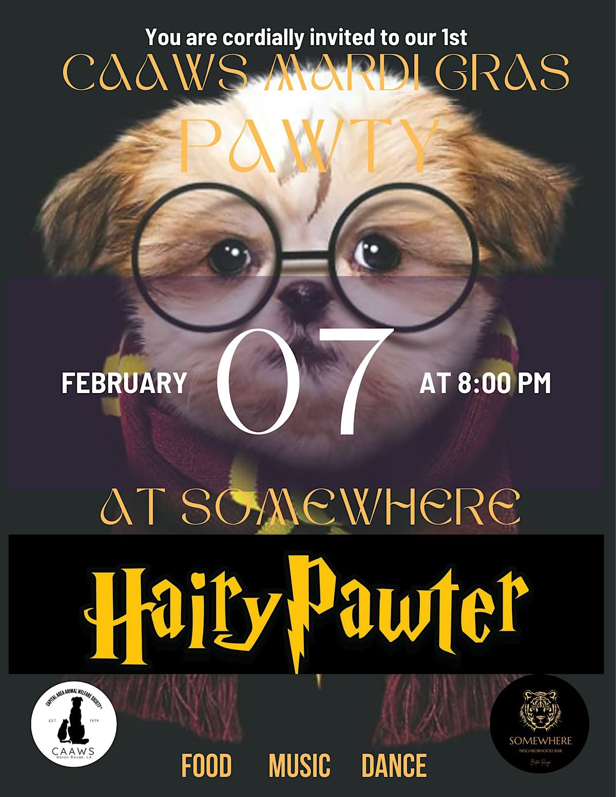 1st Ever CAAWS Mardi Gras Pawty. Ticket entitles you to 2 Free Drinks and a complimentary buffet at SOMEWHERE.