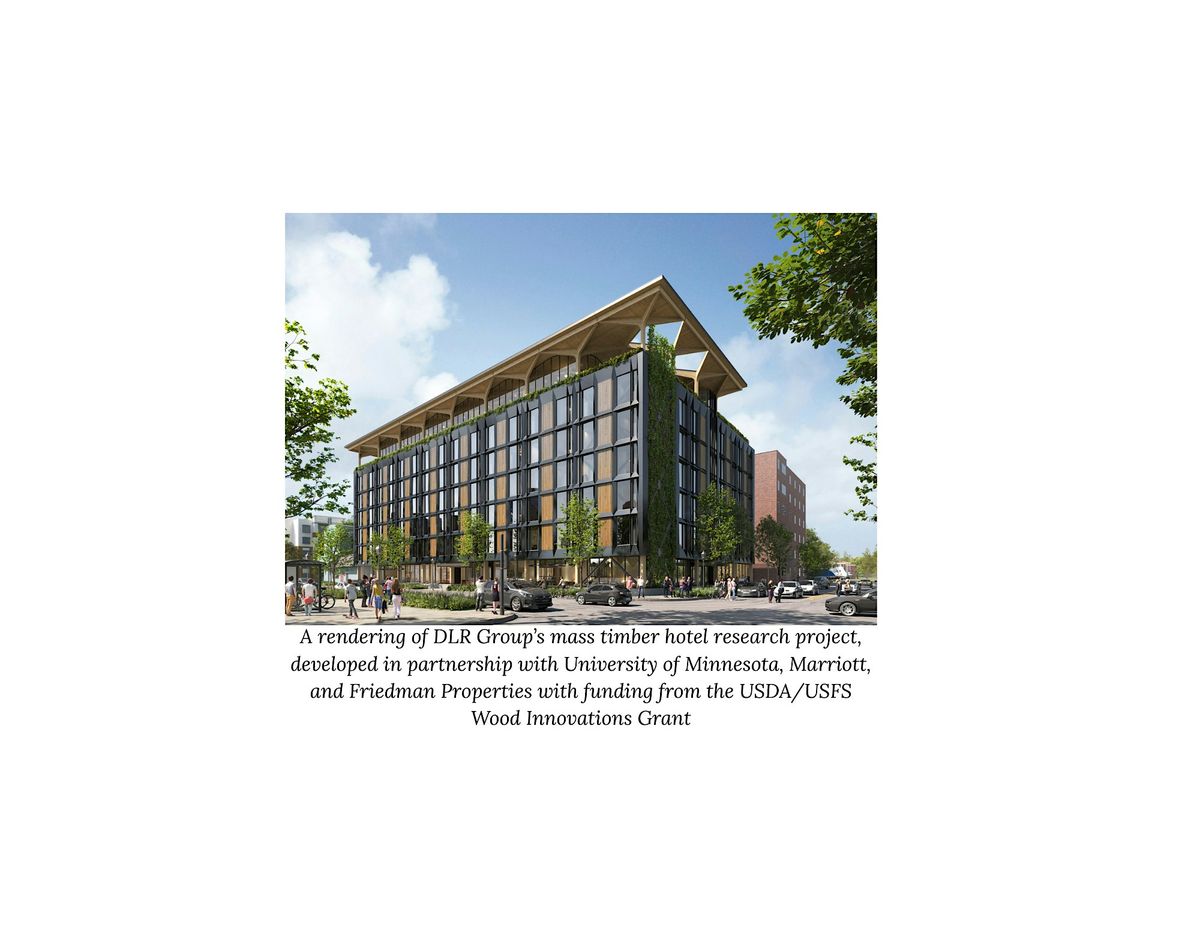 Project image: A rendering of DLR Group’s mass timber hotel research project, developed in partnership with University of Minnesota, Marriott, and Friedman Properties with funding from the USDA/USFS Wood Innovations Grant.