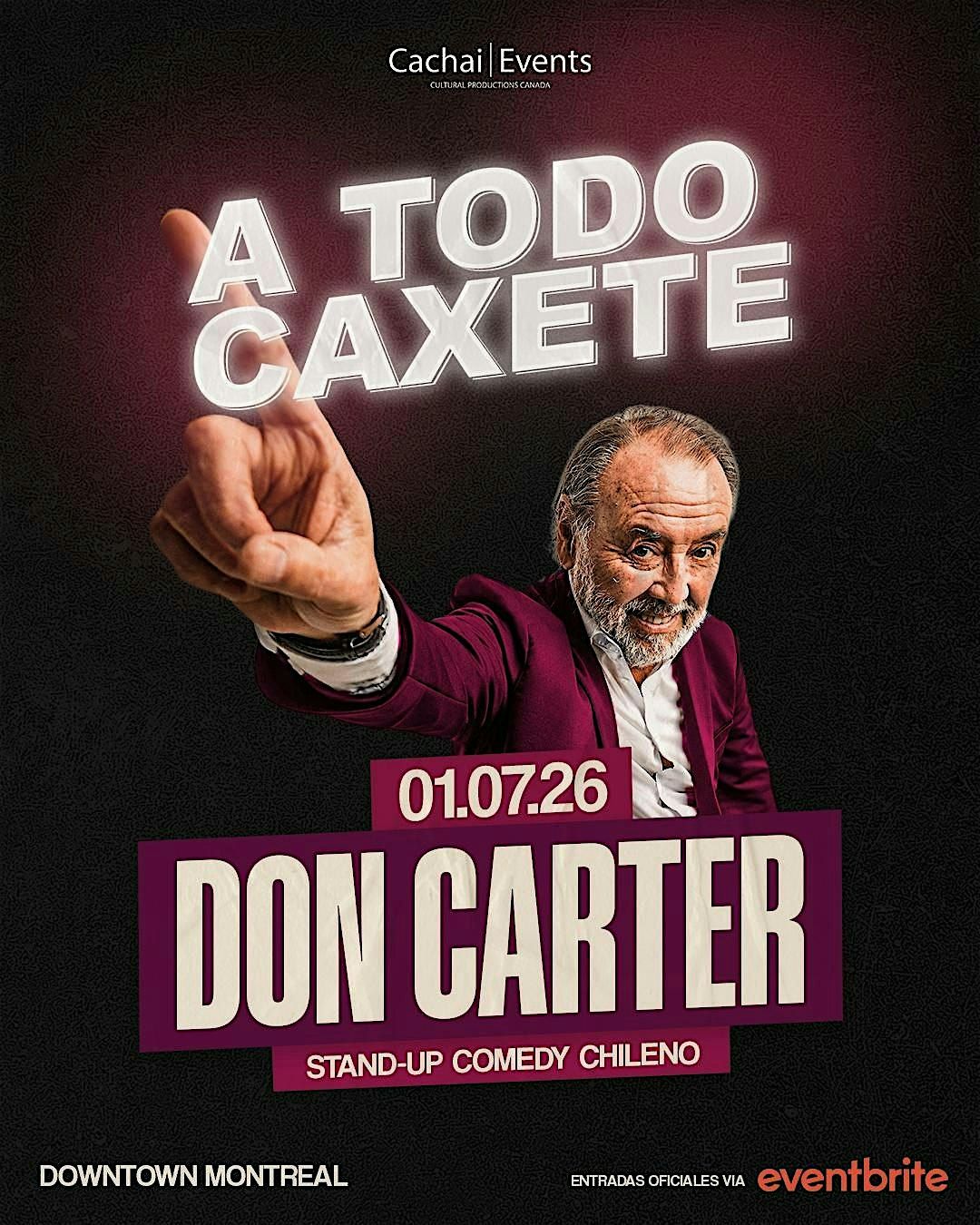 Por primera vez en Montreal, Don Carter presenta “A Todo Caxete”, un show de stand-up cargado de humor chileno e identidad cultural. Una experiencia exclusiva en formato teatro, con cupos limitados, diseñada para quienes buscan una noche de comedia auténtica y de alto nivel.