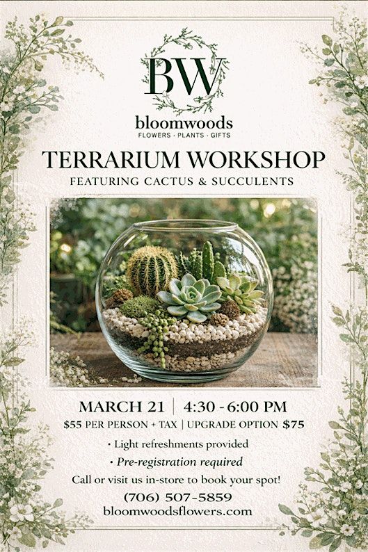 Join us at Bloomwoods Flowers & Gifts on March 21, 2026 at 4:30 PM (Eastern Time) for a fun and laid-back terrarium workshop! Whether you're a plant newbie or a green thumb, you'll love creating your own cactus and succulent masterpiece. Bring your creativity and get ready to dig in—it's a great way to relax and make something cool to take home. See you there!