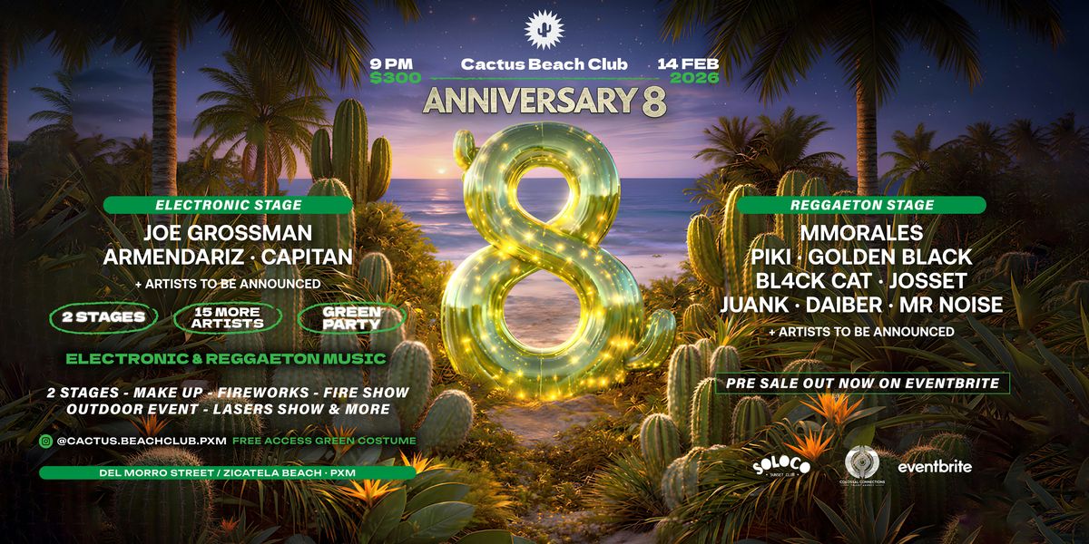 Cactus Beach Club 8th Anniversary: 2 stages, 15+ artists, electronic & reggaeton music, fire shows and Green Party vibes.