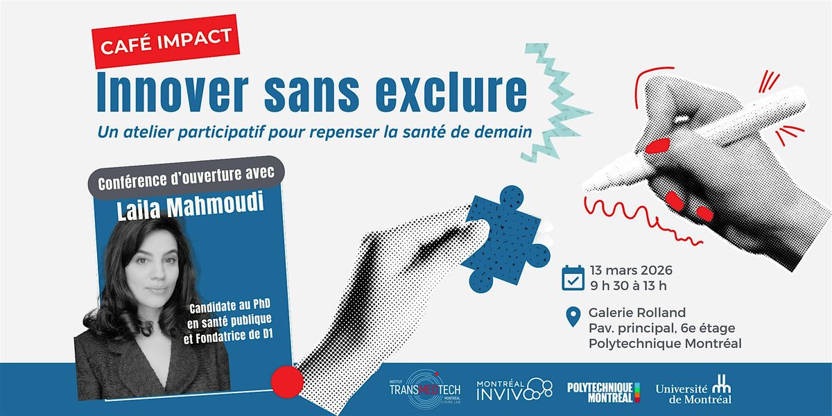 Notre café impact « Innover sans exclure » s’articulera autour d’une conférence d’ouverture avec Laila Mahmoudi, candidate au PhD en santé publique et fondatrice de D1, suivie d'un atelier participatif et se terminera par un lunch-réseautage.