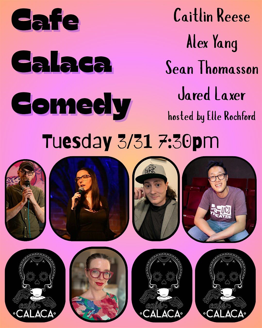 Standup comedy at Cafe Calaca! This month Calaca favorite Sean Thomasson (DTYM!) is back along with headliner Caitlin Reese (The Onion, HBO, Amazon), Alex Yang (UCB), and Jared Laxer (Outlaugh).