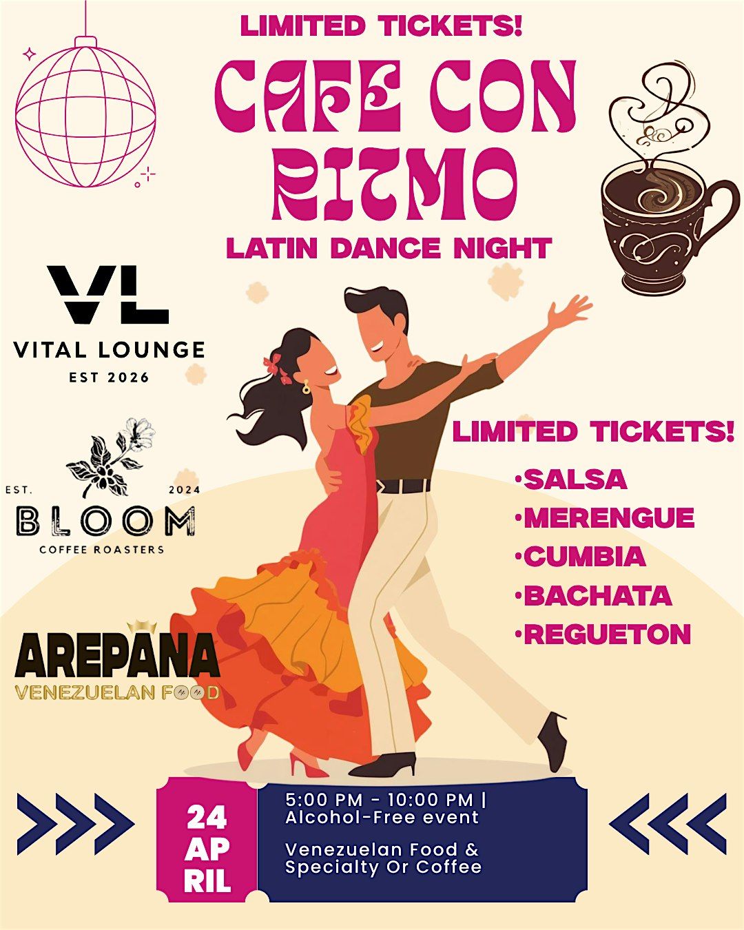 Join us for a evening full of música and energy at 1027 N Central Ave on April 24, 2026 at 5:00 PM (MST). Come enjoy great vibes, tasty coffee, venezualan food and awesome company. Whether you're here hang out and dance or catch up with friends, Cafe Con Ritmo is the place to be. Don’t miss out grab your ticket before its sold out!!!!