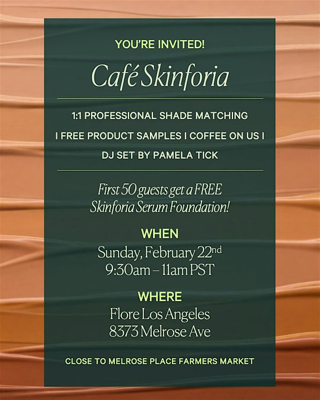 You’re invited to Café Skinforia Join us this Sunday at @florelosangeles for a fresh, feel-good morning celebrating the launch of our NEW Skinforia Serum Foundation.