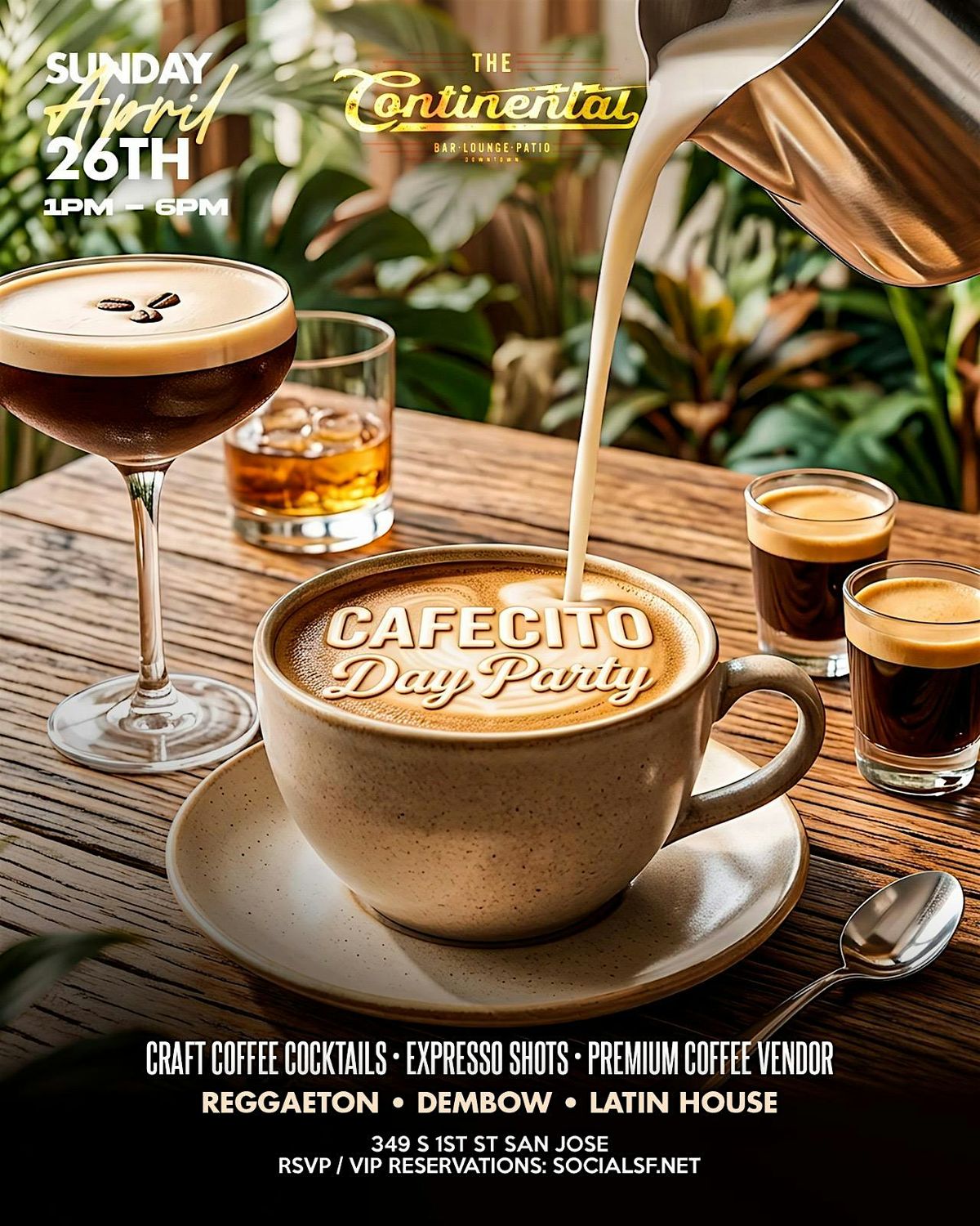 craft coffee cocktails, espresso shots, premium coffee vendors - Plus sounds of reggaeton, dembow, and latin house.