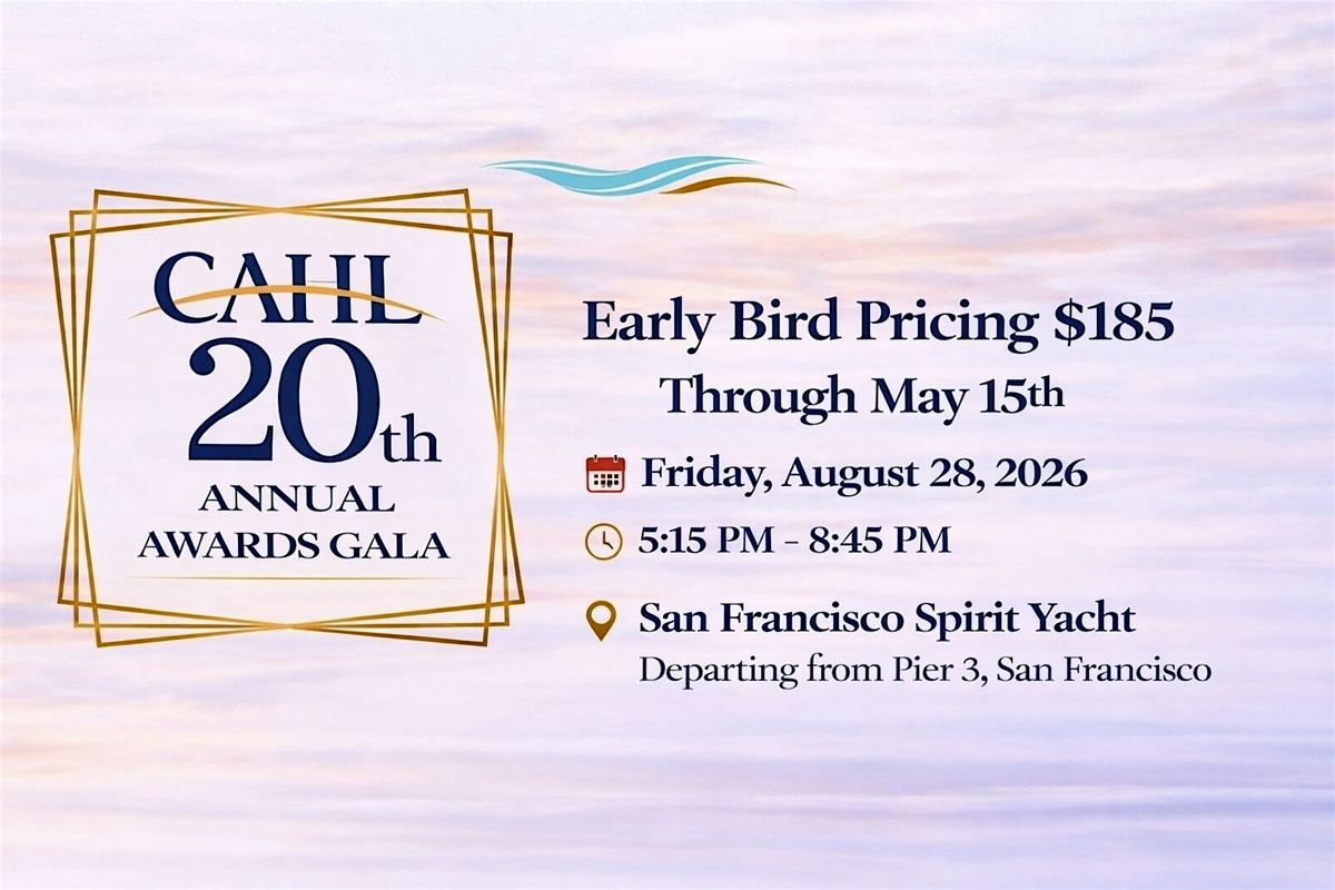 Step aboard the San Francisco Spirit Yacht and celebrate in style! This exclusive evening is reserved for CAHL members as we honor the chapter’s 20th anniversary. Enjoy champagne, a seated dinner, and your first beverage on us. Formal attire is requested for the occasion. Following the awards ceremony, continue the celebration with a lively networking reception.