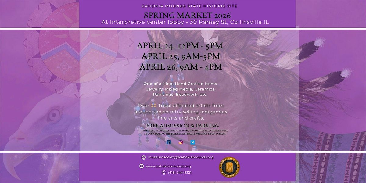 One of a Kind, Hand Crafted Items Jewelry, Mixed Media, Ceramics, Paintings, Beadwork, etc. Over 30 Tribal affiliated artists from around the country selling indigenous fine arts and crafts. SPRING MARKET 2026 At Interpretive center lobby - 30 Ramey St, Collinsville IL